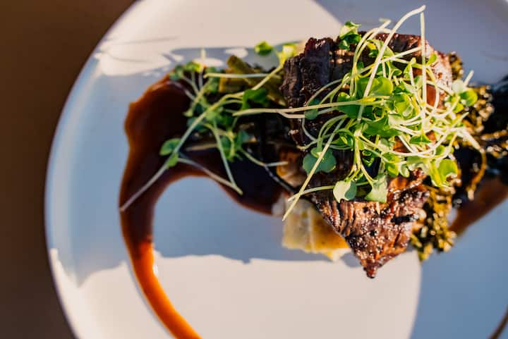 Das Menü für dieses rustikale französische Essen beginnt mit einem knusprigen Birnensalat, der mit würzigem Chèvre und knusprigen kandierten Walnüssen serviert wird. Der zweite Gang besteht aus scharf angebratenen Garnelen, die auf einem cremigen Artischockenrisotto serviert werden. Als Hauptgericht genießen die Gäste zarte, in Syrah geschmorte Rippchen, die mit einem reichhaltigen Kartoffelpüree mit brauner Butter serviert werden. Das Essen endet mit einem dekadenten Dessert aus dunklem Schokoladenbrotpudding, der mit Vanillecreme beträufelt ist.