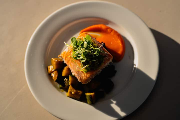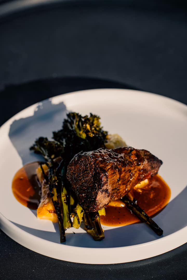 Das Essen beginnt mit einer Vorspeise aus zartem Räucherlachs, serviert mit einem Kartoffel-Schalotten-Pfannkuchen und Zitronen-Crème-Fraîche. Der nächste Gang ist eine knusprige Blätterteigtorte, gefüllt mit Pilzduxelles und Gruyère-Käse. Als Hauptgericht können die Gäste zwischen Filet Mignon vom Eichenholzgrill mit Kartoffel-Lauch-Gratin und geschmorten Brokkolini oder marokkanisch gewürztem chilenischem Seebarsch mit Perlen-Couscous und Knoblauch-Confit-Haricot-Vert wählen.
