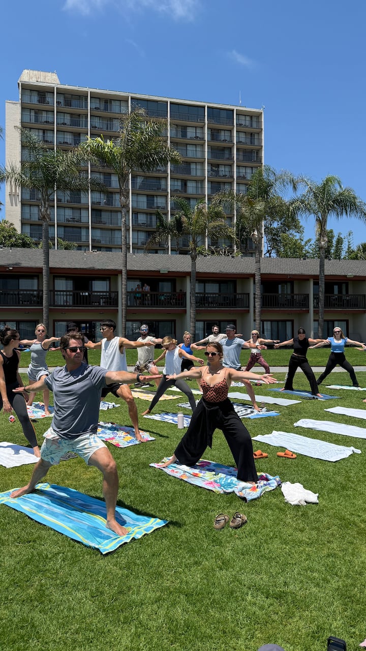 Ich habe ein Yoga-Flow- und Klangbad für alle Niveaus für ein Familientreffen mit 20 Personen in Carlsbad geleitet.