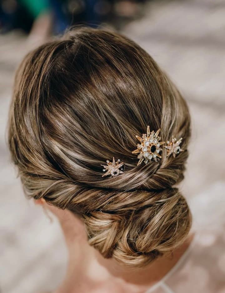 Diese Frisur besteht darin, die Mähne vom Gesicht wegzuziehen und sie auf subtile und zarte Weise am Hinterkopf zu fixieren. Es ist die ideale Option für stilvollen, edlen Stil.