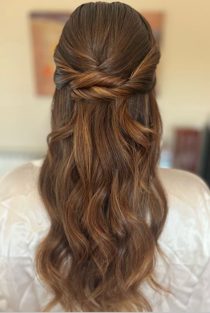 Dieser Vorschlag wurde speziell entwickelt, um die Schönheit der Verlobten zu unterstreichen. Die Haare ergänzen das Kleid, das Make-up und den Stil der frisch verheirateten Braut. Enthält einen Look mit losem Haar, hochgebunden oder halb erkannt.
