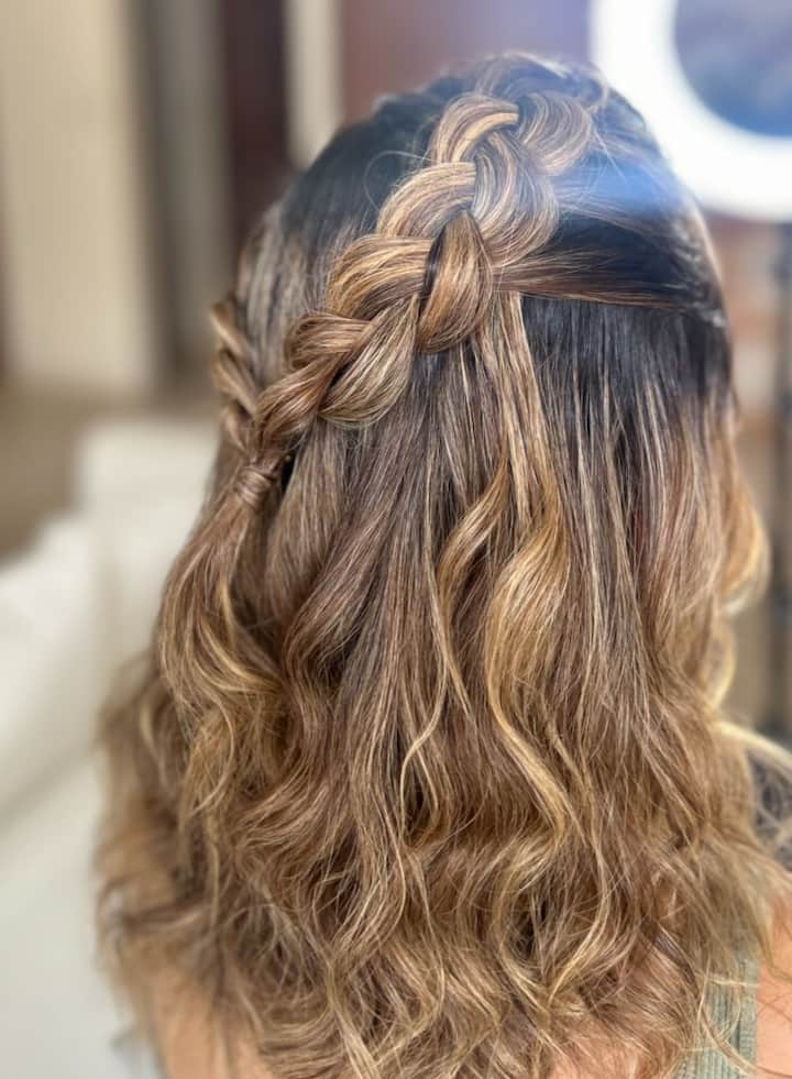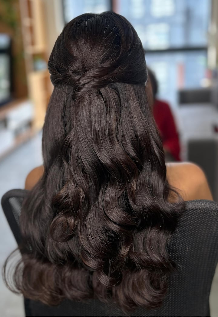 Es sieht aus wie eine Frisur, die teilweise gesammeltes Haar, sei es in einem Dutt, in einem Zopf oder mit einem Accessoire, mit lockerem, stilisiertem Haar kombiniert.