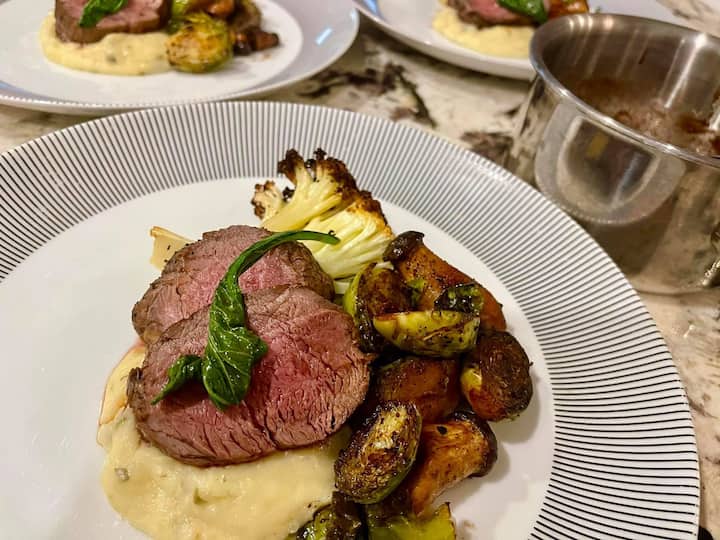 - Rindfleisch: New York Strip, eingelegter Rettich, Kartoffelpüree, gebratenes Gemüse, Rinderjus.