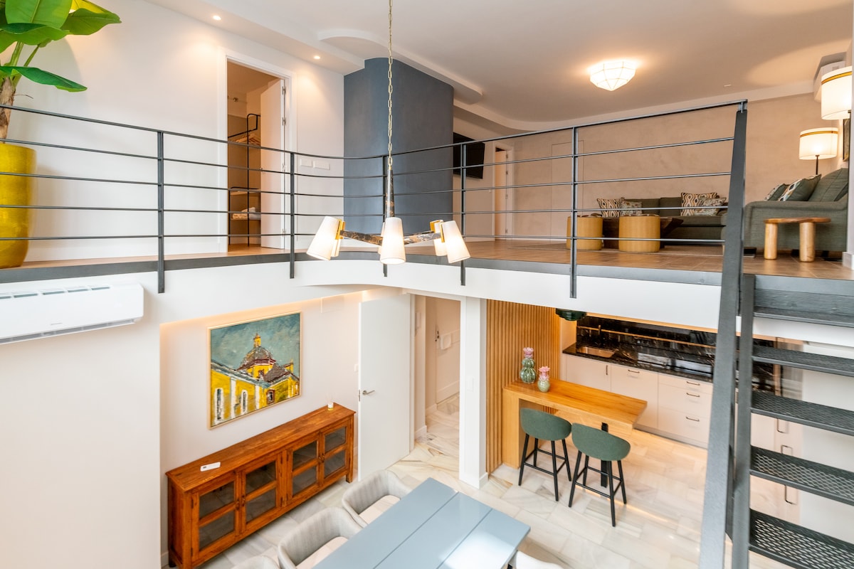 Zieh einen luxuriösen goldenen Stuhl für ein gemütliches Abendessen mit Freunden heran oder kuschel dich in das moderne Himmelbett in einer stilvollen, wunderschön gestalteten, renovierten Oase im historischen Zentrum von Sevilla. Entspanne dich im privaten Whirlpool oder auf der grünen, tropischen Dachterrasse.