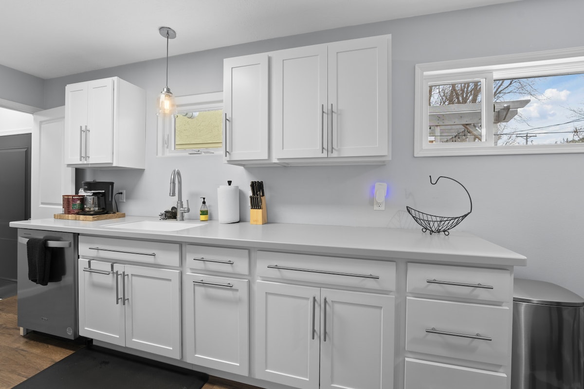 Die perfekte Unterkunft für Arbeit oder Freizeit (oder einen Zwischenstopp durch die Stadt)! Mach es dir vor dem Kamin auf der großen Couch gemütlich und streame deine Lieblingssendungen auf dem 48-Zoll LED-Fernseher (nur Netflix, kein Kabel) und mache eine Pause vom Entspannen und erledige die Arbeit am Schreibtisch. Iss zum Mitnehmen auf dem hohen Tisch in der Küche oder bereite deine eigene Mahlzeit mit der großen Küche zu. Der Ort ist voll ausgestattet, von Geschirr und Besteck, frischen Handtüchern und Bettwäsche bis hin zu Seife und Shampoo.