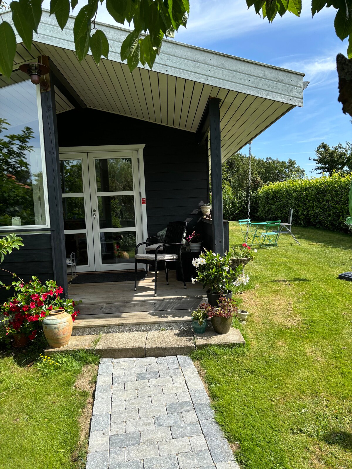 Kleines Holzhaus in einem großen parkähnlichen und üppigen Garten, privat und getrennt vom Haupthaus, nur ein paar Minuten von einem großen Wald, schönen Stränden und einer charmanten Stadt mit Geschäften, Cafés und Restaurants entfernt und in der Nähe des Zuges. Es verfügt über ein Hauptraum mit zwei zusammengefügten Betten, eine separate Küche für einfaches Kochen und ein Badezimmer. Die Terrasse hat ein Dach und ist von Blumen, Bäumen und Büschen umgeben. Geeignet für einen romantischen Kurzurlaub.