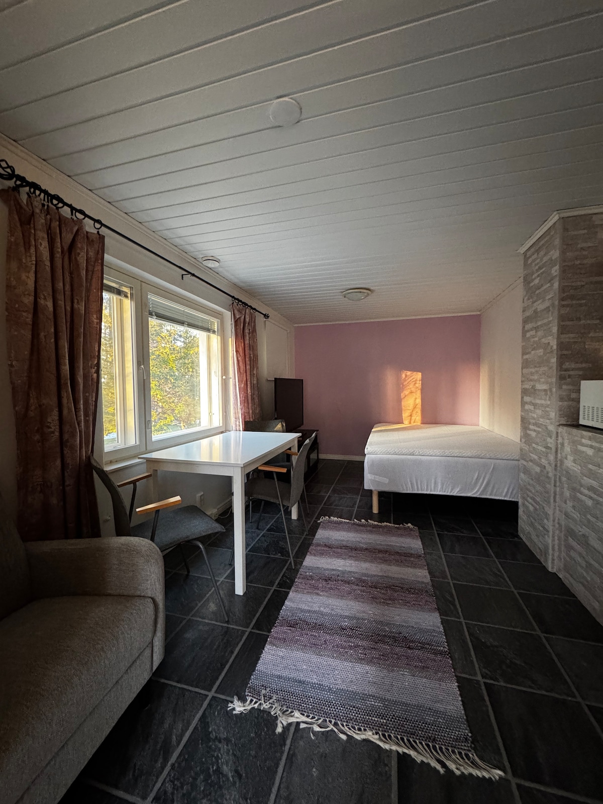 Gemütliche kleine Einzimmerwohnung mit Sauna in Nurmes, in der Gemeinde Valtimo. Die Wohnung ist am besten für ein paar Gäste geeignet, aber es passen vier hinein, wenn man das Schlafsofa als Zustellbett benutzt. Endwohnung eines Reihenhauses, im Hinterhof eine neue Terrasse mit Sofagruppe. Parkplatz vorhanden. Bettwäsche und Handtücher sind im Preis inbegriffen, Kaffee und Tee werden angeboten. Zum Kochen stehen Öl, Salz und Pfeffer bereit.