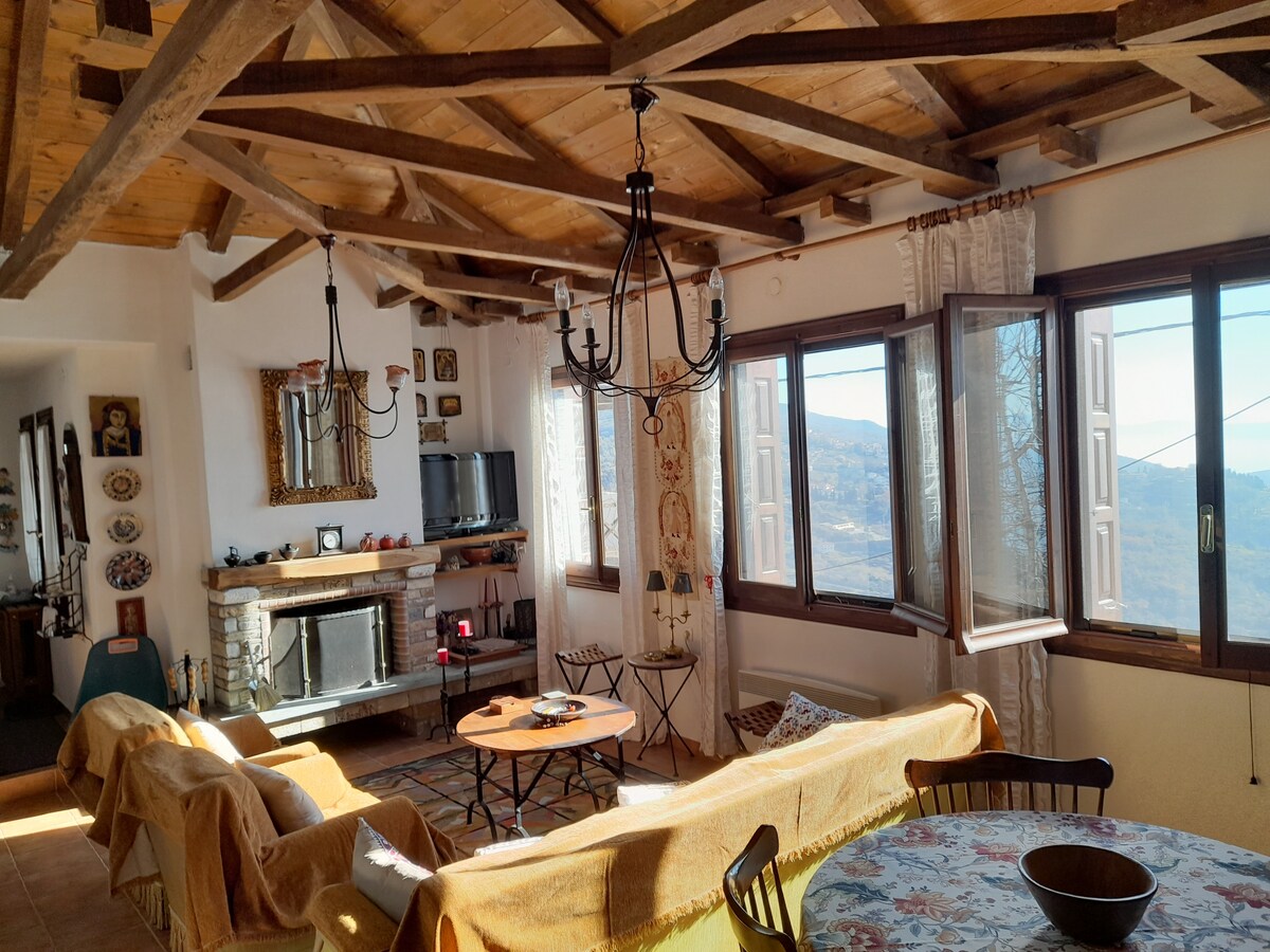 * Neue Matratzen 2025! * Renoviertes altes zweistöckiges Haus aus Stein auf einem Grundstück mit herrlichem Blick auf die Ägäis im höchsten Teil des traditionellen Dorfes Zagora. Tolle Wahl für Familien, eine Gruppe von Freunden oder Paare, die Ruhe und Komfort für ihren Urlaub suchen; entweder im Sommer oder im Winter.
