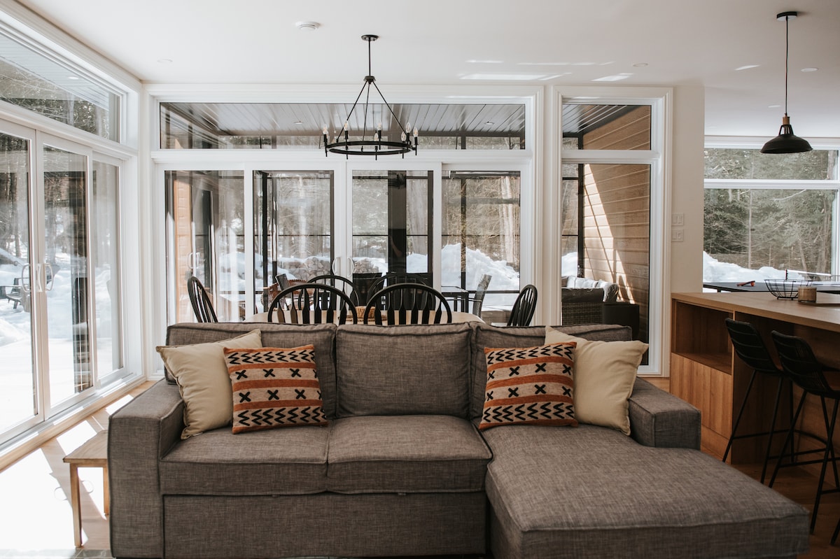 Monumental open concept, in the heart of nature. Access to trails directly behind the house. Wood stove, large modern bathroom, one bedroom + sofa bed. Another sofa bed in the living room. Ideal chalet for a couple with children or two couples. Wild birds, turkey, and deer lovers welcome! Wifi and EV charger included. Dogs Welcome! CITQ : #308038