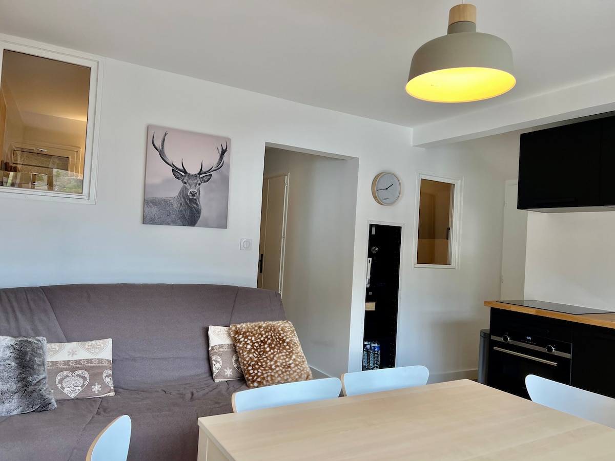 Séduisant appartement avec une chambre 4 couchages. Son balcon exposé sud-est offre avec magnifique vue dégagée sur les sommets. Il est situé à 150m du centre de la station et des remontées mécaniques. Cet appartement tout confort est composé d'un séjour avec un canapé convertible (2 personnes) , d'un coin cuisine entièrement rénové et équipé, d'une chambre avec un lit 2 personnes et 2 lits superposés 1 personne, d'une salle d'eau et WC séparés. Détendez-vous dans ce logement calme et élégant.