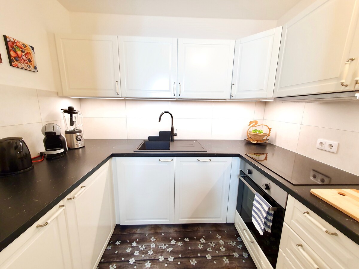 Unsere 2-Zimmer-Wohnung mit 1 Badezimmer, Küche, geräumigem Wohnzimmer mit Couch und Esstisch, Klimaanlage und geräumiger Terrasse befindet sich nur etwa 100 Meter vom Bleder See (Schwimmbereich) entfernt. Sie befindet sich in einer sehr ruhigen Gegend. Sie verfügt über einen eigenen Eingang und befindet sich in unserem Haus (so sind wir immer in der Nähe, um zu helfen). Wir sind eine 5-köpfige Familie und freuen uns, dich begrüßen zu dürfen. Nachhaltigkeit: Wir produzieren mehr Energie, als wir verbrauchen. Die Kurtaxe (3,13 für Erwachsene pro Tag, 1,56 für Kinder über 7 Jahre) ist nicht enthalten.