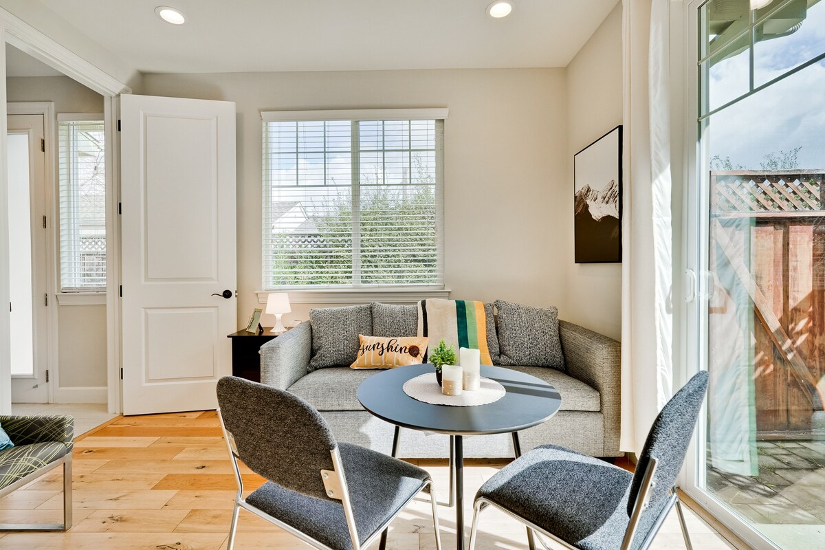 Gehobene, private Suite mit separatem Eingang in ruhiger, sicherer Gegend im Zentrum des Silicon Valley! Nur wenige Minuten von Apple/High-Tech-Unternehmen, einer kosmopolitischen Innenstadt, trendigen Restaurants, Bars und einem historischen Park für gemütliche Spaziergänge entfernt. Nur wenige Blocks zur US-101, Central Expy und öffentlichen Verkehrsmitteln. Genieße die warme Einrichtung, die komfortable Queensize-Beautyrest-Matratze, luxuriöse Bettwäsche, eine voll ausgestattete Kaffeebar, eine private Terrasse mit Blick auf einen ruhigen Hinterhof sowie unbegrenzte kostenlose Parkplätze an der Straße.