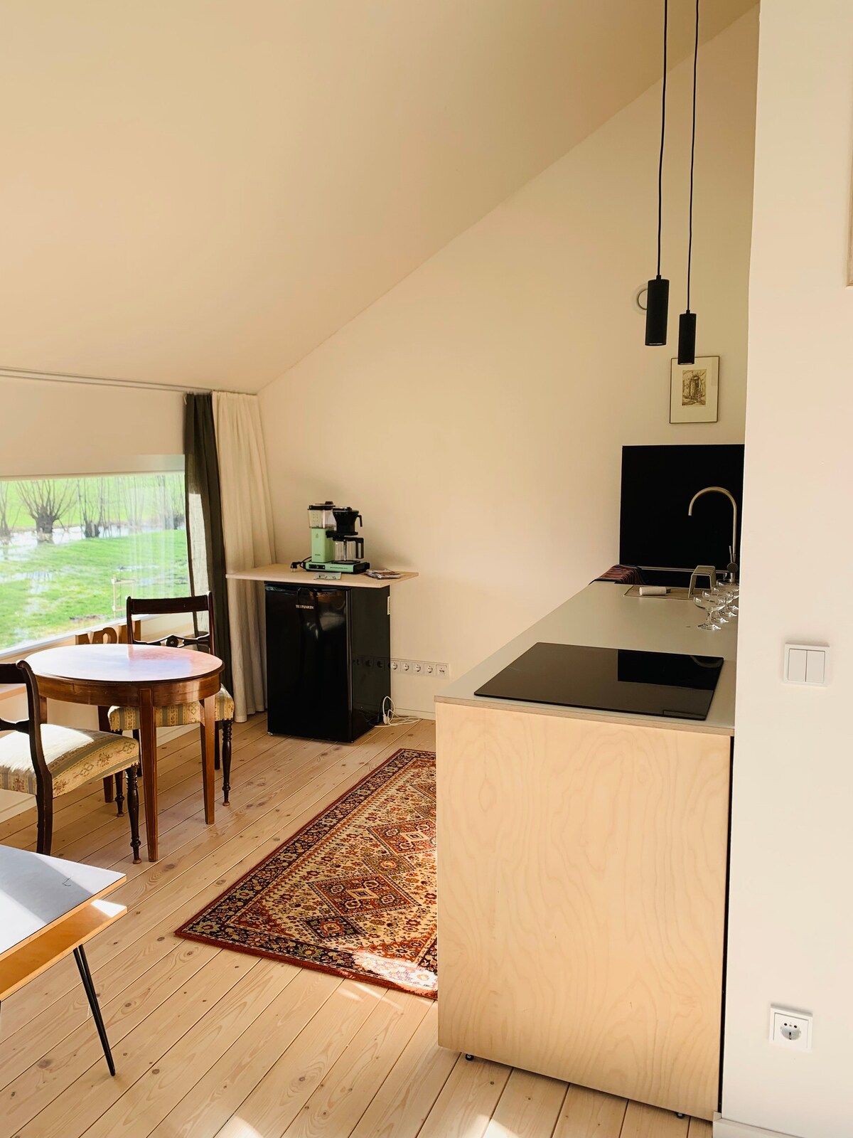 Die Unterkunft befindet sich in einem Neubau, der auf unserem Grundstück steht. Die neu eingerichtete 2 Zimmer Nichtraucher-Wohnung, erreichst du über wenige Stufen. Du findest eine moderne und komplett ausgestattete Küchenzeile mit Herd, Backofen, einem Geschirrspüler, einem Spülbecken, einem Kühlschrank mit einem Gefrierfach. Eine Kaffe-Pad-Maschine ist auch vorhanden. Im Wohnbereich befindet sich eine Schlafcouch , die Liegefläche beträgt 140x200 cm.
