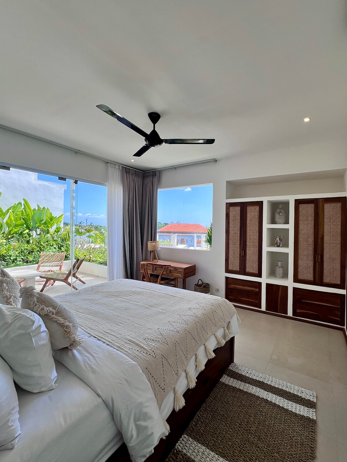 Built 2 years ago with high end quality materials, this stylish and spacious 3 bedrooms villa offers breathtaking views on the rice terraces of Canggu/Mengwi Fully air-conditioned, big volumes, lots of space, large sliding glass doors and windows to enjoy the amazing views whichever room you are in. 3 bedrooms with en-suite bathrooms, spacious living area, equipped kitchen, outdoor kitchen with BBQ and huge roof top with lawn, jacuzzi and lounge area, overlooking the rice paddies!