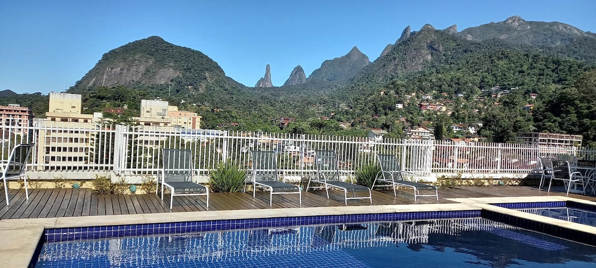 Komfortables Loft, tolle Lage, in der Nähe der wichtigsten Sehenswürdigkeiten, Alto-Viertel, weniger als 100 Meter vom lokalen Handel entfernt, in der Nähe von Feirinha do Alto, Unifeso, Vila Saint Gallen, Bars und Restaurants, weniger als 1 km vom Nationalpark und der CBF entfernt. Es verfügt über eine überdachte Garage, einen 24-Stunden-Portier, einen Freizeitbereich mit herrlichem Blick auf den Dedo de Deus, einen Swimmingpool, eine Sauna, einen Fitnessraum, eine Lese-Lounge und einen Fernseher.