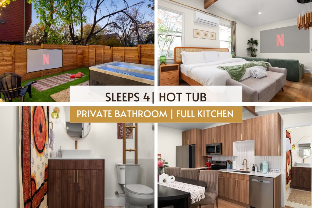 Dieses gemütliche Ferienhaus in Austin verbindet altmodischen Charme mit modernem Komfort. Zentral gelegen in einer schrulligen, fußläufigen Nachbarschaft, ist es nur wenige Schritte von Cafés, Cocktailbars, Restaurants, Vintage-Läden, Plattenläden und vielem mehr entfernt. Entspannen Sie sich in Ihrer privaten, üppigen Gartenoase, sicher und gemütlich, aber nur eine kurze Fahrt von der 6th Street, Rainey, Zilker Park und den Sehenswürdigkeiten der Innenstadt entfernt. Gäste lieben die authentische Atmosphäre von Austin, die tolle Lage, die bequemen Betten, die Privatsphäre und die durchdachten Details, die sich wie zu Hause anfühlen.
