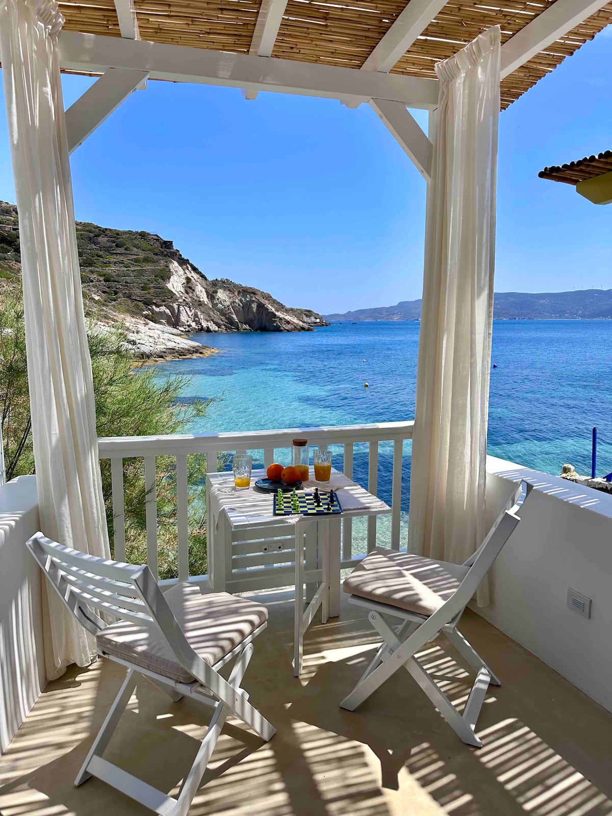 Die Wind Apartment ist ein ruhiger Rückzugsort am Meer in Firopotamos, Milos – eine der schönsten Inseln im Mittelmeer. Diese charmante Wohnung bietet ein einzigartiges Erlebnis, bei dem sich der Balkon buchstäblich über das Wasser erstreckt und der Strand, der voller Menschen ist, sich zu deinen Füßen ausbreitet.
