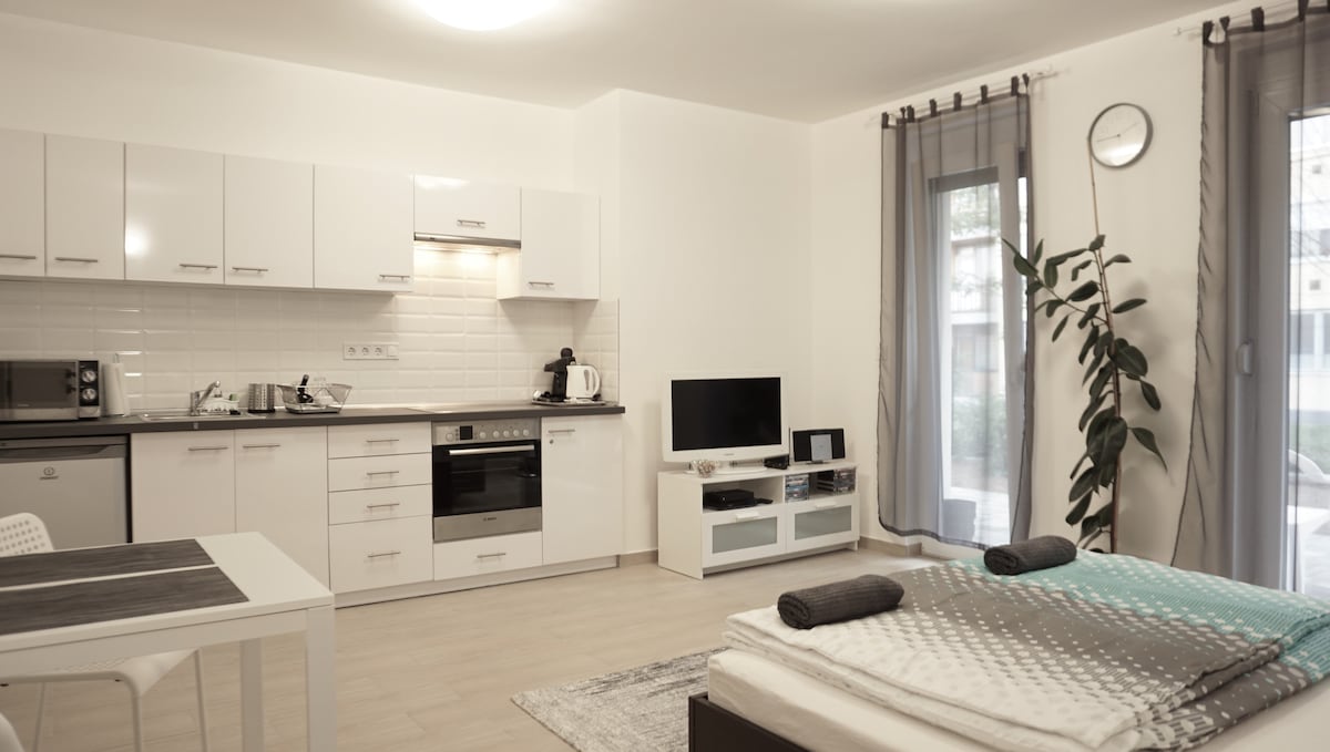 Willkommen in unserer gemütlichen Wohnung in einer Wohnanlage im italienischen Stil. Diese Unterkunft ist perfekt für diejenigen, die Ruhe und Komfort schätzen. Das Hauptmerkmal ist ein geräumiger Balkon mit Whirlpool, Außendusche, Liegestühlen und einem Essbereich. Der Komplex ist von Geschäften, darunter 24-Stunden-Geschäften, und Cafés umgeben. Die günstige Lage bietet eine gute Anbindung an die öffentlichen Verkehrsmittel, sodass du jeden Punkt der Stadt schnell erreichst. Unsere Wohnung ist dein gemütlicher Rückzugsort in der Stadt.
