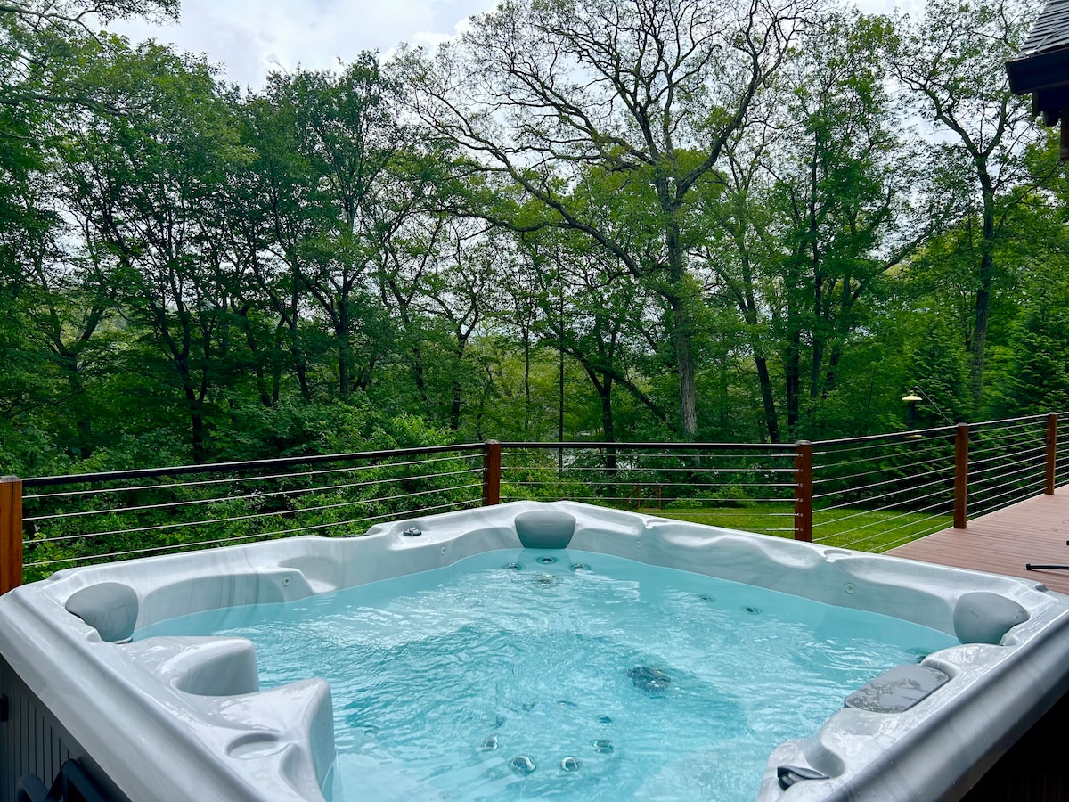 Diese Designer-Hütte verbindet natürliche Materialien und moderne Oberflächen. — anspruchsvoll und gemütlich. Blicke auf den atemberaubenden, quellgespeisten Teich (oder schwimme darin!) – nur wenige Schritte vom Haus entfernt. Entspanne dich auf der Terrasse oder genieße Kaffee im Sonnenzimmer. Die Innenräume verfügen über drei Schlafzimmer, zwei Badezimmer, ein Wohnzimmer mit schicken und gemütlichen Möbeln und einem Holzkamin sowie eine voll ausgestattete Küche, in der das Kochen zum Vergnügen wird. Unterhalte deine Familie und Freunde am Tisch für 10 Personen und gehe dann mit einem Getränk in der Hand weiter auf das Grundstück.