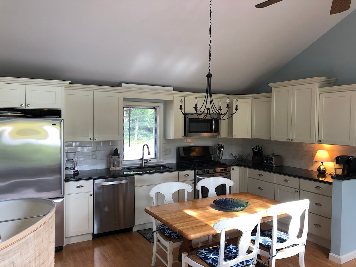 Klassisches, wunderschön gestaltetes, neueres Ferienhaus an der Cape Cod Bay. Alle Annehmlichkeiten. Edelstahlküche, Kathedralendecke, Holzdielen, Wasserblick. 2 Gehminuten zu einem der besten Strände am Kap! Ruhiger Ort im historischen Dorf Quivet Neck, in East Dennis. 35 Meilen nach Provincetown. Ich erlaube keine Haustiere. Ich habe Familienmitglieder mit schweren Allergien, die das Ferienhaus nutzen. Es gibt keine Klimaanlage in diesem Ferienhaus. Ich habe 15 Fenster, 4 Ventilatoren und eine Meeresbrise.
