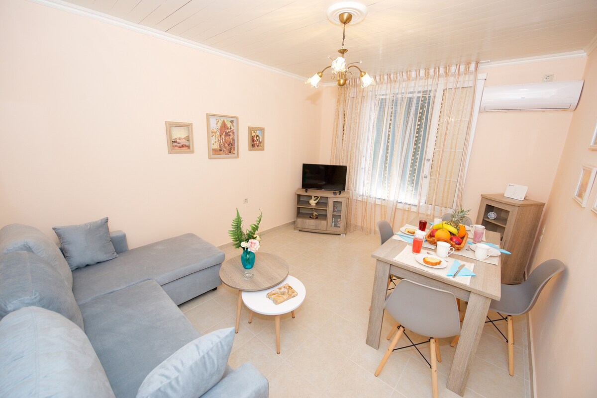 Renovierte Wohnung vor dem Meer, 20 m vom kristallklaren Wasser von Glyfada entfernt. Ein Zimmer mit einem Doppelbett, einem hellen Wohnzimmer mit einem geräumigen Schlafsofa, einer voll ausgestatteten Küche und einem Badezimmer mit einer Waschmaschine, 55'' 4K Smart TV und einem Esstisch für vier Personen. Vordere Terrasse mit Tisch für sechs Personen, zwei Liegestühlen und zwei entspannenden Sesseln mit großem Sonnenschutz. Ruhiger Hinterhof mit Tisch für vier. Kostenloser privater Parkplatz und Internet.