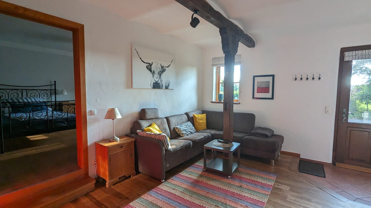 Die 120qm Wohnung ist eine Hälfte eines Bauernhauses von 1898 und wurde renoviert. Umgeben von Feldern liegt das Haus in Alleinlage und ist perfekt um die Natur und Ruhe zu genieß. Es gibt zu der Wohnung einen Garten mit Terrasse und auch ein Grill steht auf Anfrage zur Verfügung. Von der Südterasse sieht man über Felder hinweg auf das nahe gelegene Wiehngebirge.