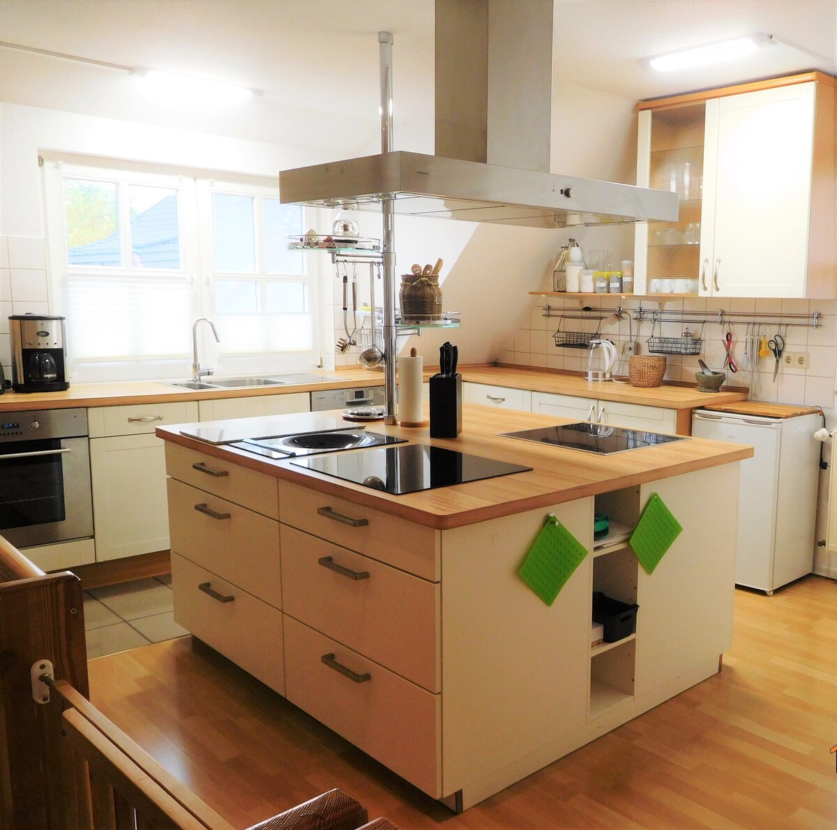 In der 2. Etage erwartet dich ein außergewöhnlicher Einrichtungsstil: Landhaus-maritim trifft Moderne. Größtenteils Vollholzmöbel, hochwertiges Laminat und Fliesen. Auf dem kleinen Balkon kann man den Blick ins Grüne und den Sonnenuntergang genießen. Die separate Küche ist voll ausgestattet mit Herd, Ofen, Mikrowelle etc.. Erholsamer Schlaf im Bett mit Bonell-Federkern-Matratzen. Ein Home-Office Arbeitsplatz kann bei Bedarf eingerichtet werden (Schreibtisch, ergonom. Stuhl), schnelles WLAN
