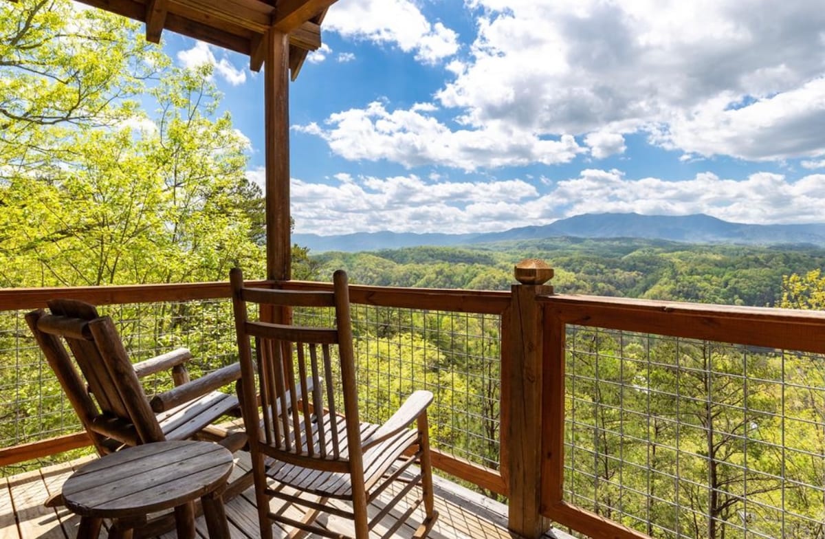 Entfliehe in deine eigene ruhige Oase in den Smoky Mountains. Entspanne dich in unserer auffälligen, luxuriösen Hütte mit herrlichem Panoramablick auf die Smokies, den du mit raumhohen, getönten Fenstern bewundern kannst. Unsere Oase verfügt über 2 Steinkamine, eine Gourmet-Küche, eine abgeschirmte Veranda und ein Loft. Die geräumige Hauptsuite verfügt über einen Eingang auf der hinteren Terrasse, auf der du Sonnenuntergänge im Whirlpool genießen kannst! Dieser Rückzugsort liegt 4 Meilen von Dollywood, weniger als 4 Meilen vom Hauptparkway und 11 Meilen von Gatlinburg entfernt.