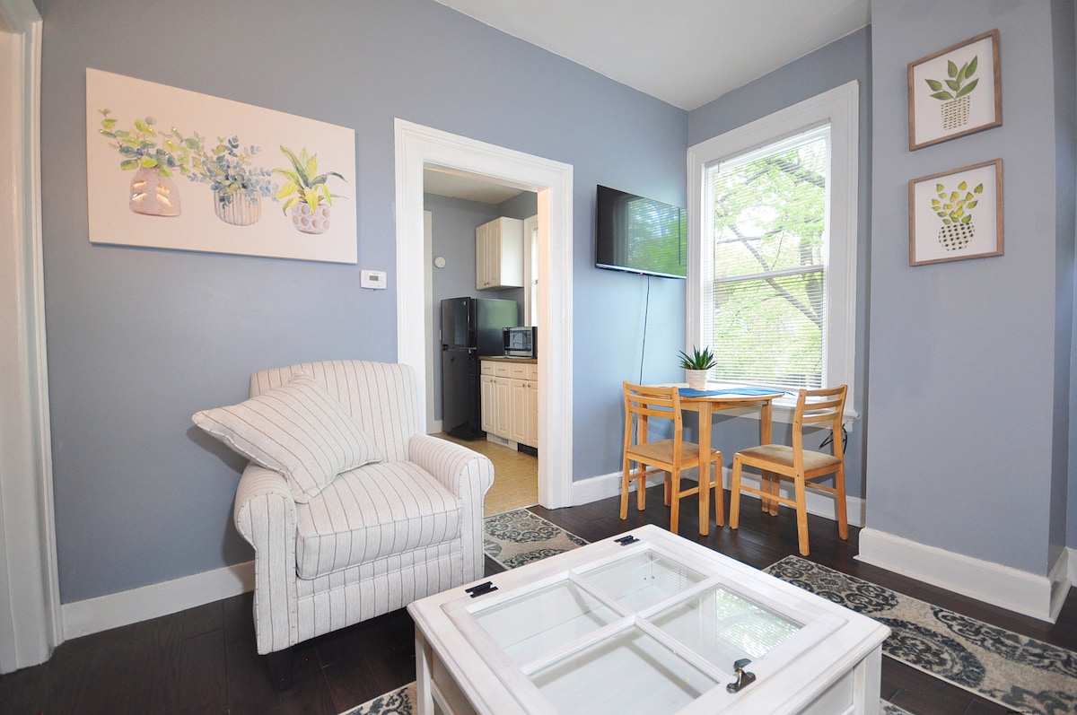 Lehne dich zurück und entspanne dich in diesem ruhigen, stilvollen Raum. Dieses Studio-Apartment bietet schnelles Internet, einen TV, eine komfortable Couch, ein stilvolles neues Badezimmer, eine schöne Küchenzeile sowie Verdunkelungsvorhänge im Schlafzimmer. Und ein gemütlicher warmer Kamin. Diese Wohnung bietet bequem Platz für 1 Erwachsenen oder ein Paar. Die Couch lässt sich zu einem Bett ausklappen und dort befindet sich Bettwäsche in einer unter dem Bett.
