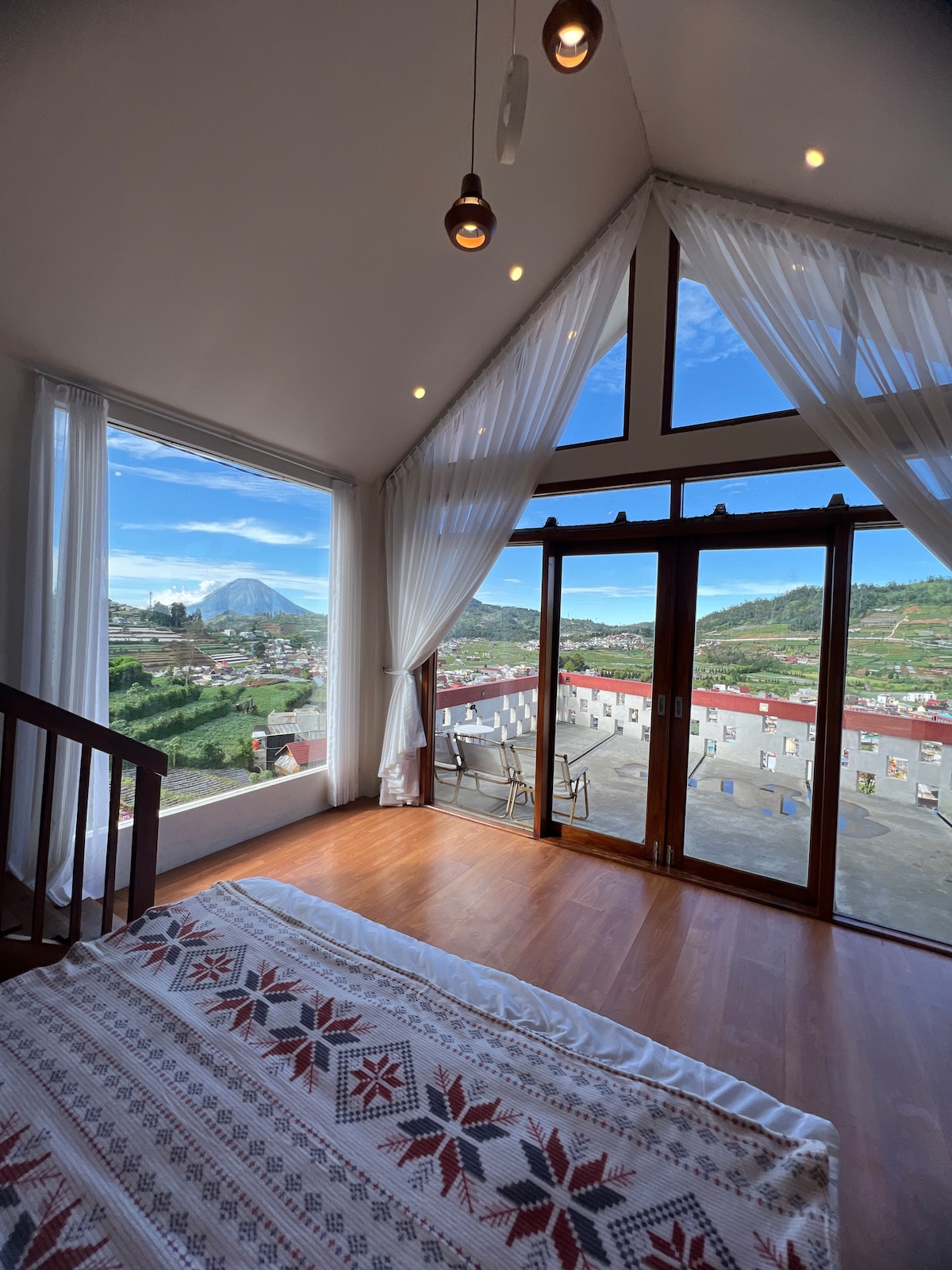 Bersantailah bersama seluruh keluarga atau orang tercinta di tempat menginap yang tenang ini dengan menikmati view landsacpe dan pegunungan Dieng atas awan.