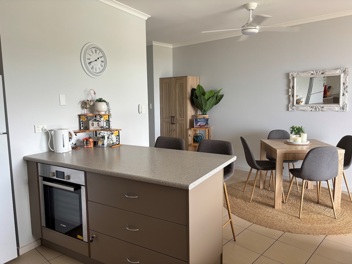 Australian Host of the Year Awards 2024 - Finalist Entspannung plus, und ihr habt alles für euch allein - eine separate private Wohnung in einem tropischen Garten. Ungewöhnlich findest du viel Platz im Inneren sowie eine Brise und eine große Terrasse mit Blick auf die Keppel Bay und Yeppoon. Es gibt ein Kingsize-Bett, ein bequemes Sofa, WLAN, einen 55-Zoll-Smart-TV, einen Esstisch und eine hochwertige Küche und ein Badezimmer. Hinweis: Der Zugang erfolgt über 2 Ziegeltreppen von der Straßen- und Gartenebene.